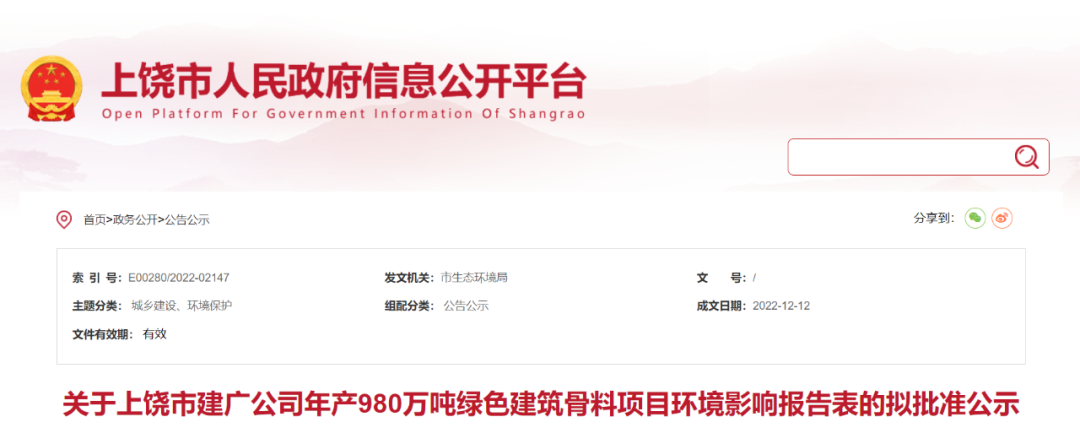 12月12日,江西省上饒市人民政府對(duì)上饒市建廣綠色建筑材料有限公司年產(chǎn)980萬(wàn)噸綠色建筑骨料項(xiàng)目環(huán)境影響報(bào)告表予以批準(zhǔn)公示。