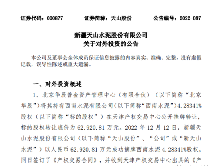 12月12日,新疆天山水泥股份有限公司(股票簡稱:天山股份 股票代碼:000877)發(fā)布公告稱,天山股份以人民幣62920.81萬元(約6.3億元)成功摘牌西南水泥 4.28341%股權(quán), 同日簽訂了《產(chǎn)權(quán)交易合同》,并收到天津產(chǎn)權(quán)交易中心出具的《產(chǎn)權(quán)交易憑證》。