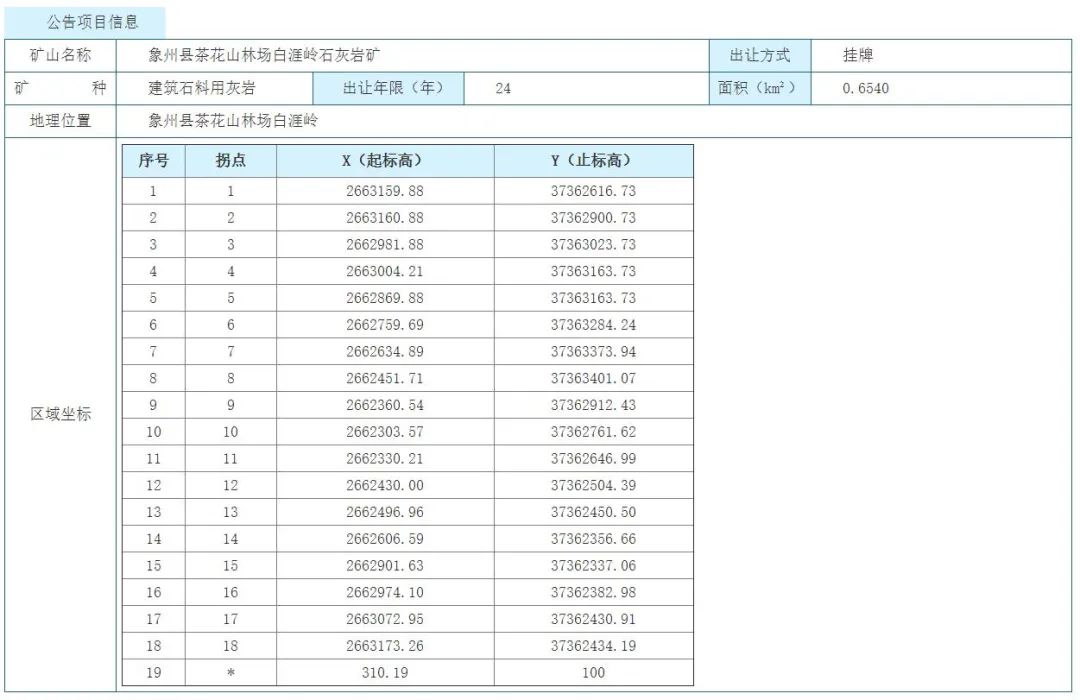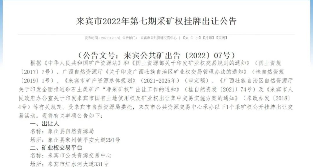 12月13日,廣西來(lái)賓市象州縣茶花山林場(chǎng)白涯嶺石灰?guī)r礦采礦權(quán)掛牌出讓,擬出讓24年(含礦山基建期0.5年),起始價(jià)17530萬(wàn)元。