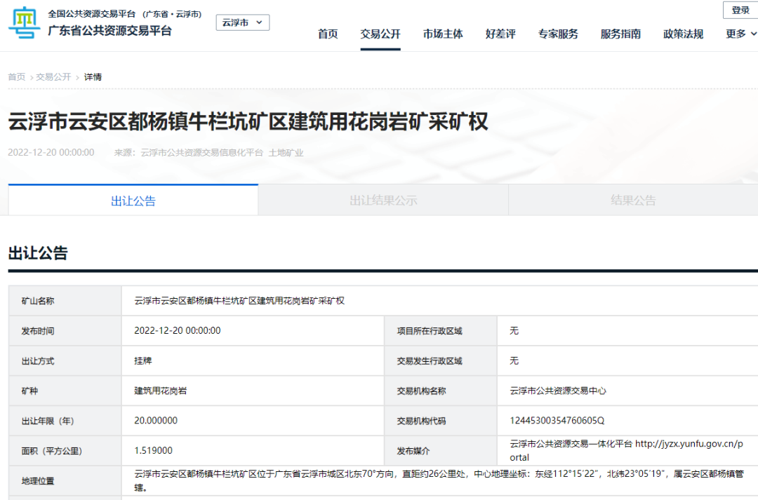12月20日,云浮市又掛牌出讓一建筑用花崗巖采礦權(quán),儲(chǔ)量14842.59萬方,年生產(chǎn)規(guī)模850萬方,出讓年限20年(含
