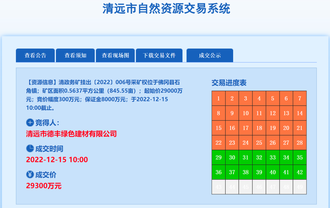 2、清遠(yuǎn)市佛岡縣石角鎮(zhèn)誠(chéng)逕礦區(qū)建筑用花崗巖礦:競(jìng)得人:清遠(yuǎn)市德豐綠色建材有限公司,成交價(jià):29300萬(wàn)元。出讓資源儲(chǔ)量:3151.1萬(wàn)立方米。礦山設(shè)計(jì)生產(chǎn)規(guī)模:200萬(wàn)立方米/年。