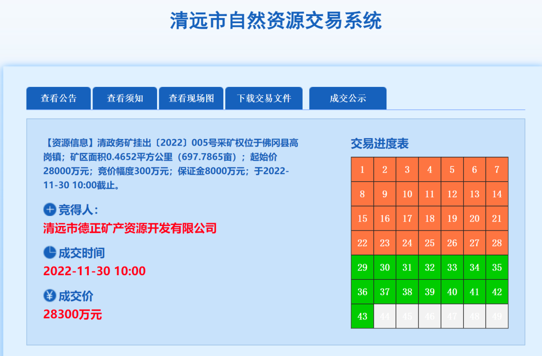 1、廣東省佛岡縣高崗鎮(zhèn)壙肚村礦區(qū)建筑用花崗巖礦:競(jìng)得人:清遠(yuǎn)市德正礦產(chǎn)資源開(kāi)發(fā)有限公司,成交價(jià):28300萬(wàn)元。出讓資源儲(chǔ)量:2445.09萬(wàn)立方米。