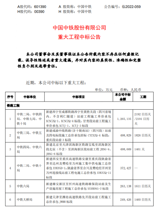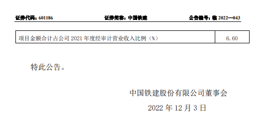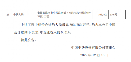 中國中鐵中標價合計約人民幣589億元,約占公司2021年營業(yè)收入的5.51%。