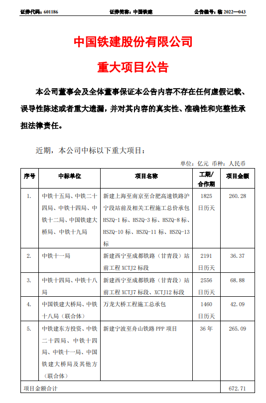 中國鐵建發(fā)布重大項目公告稱,已中標合計672億重大項目。