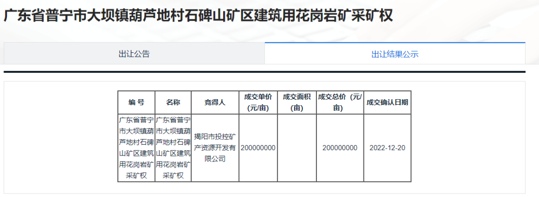 1、普寧市大壩鎮(zhèn)葫蘆地村石碑山礦區(qū)建筑用花崗巖礦:競得人:揭陽市投控礦產(chǎn)資源開發(fā)有限公司,成交價:20000萬。出讓資源儲量:3023萬m?。