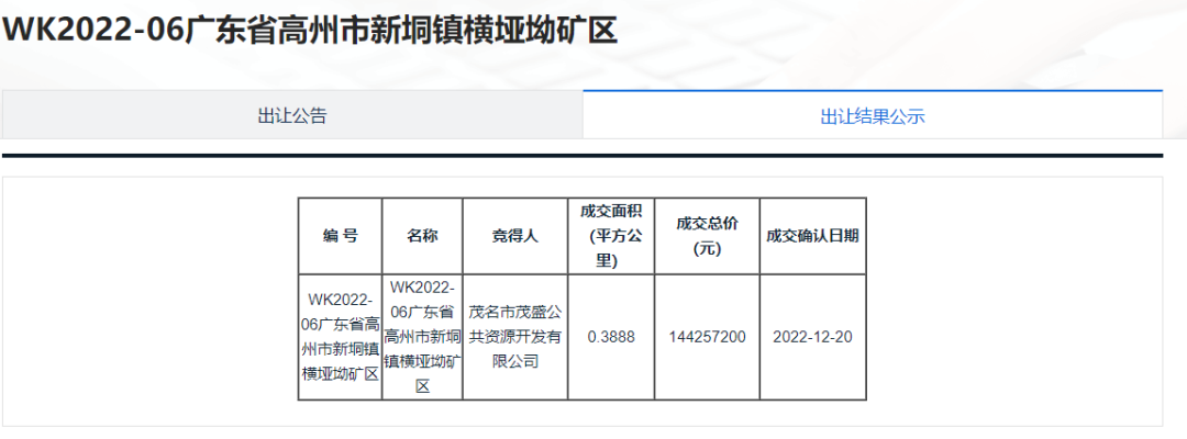 2、高州市新垌鎮(zhèn)橫埡坳礦區(qū):競得人:茂名市茂盛公共資源開發(fā)有限公司,成交價:14425萬。出讓資源儲量:4357萬m?。礦山設(shè)計生產(chǎn)規(guī)模:340萬m?/年。