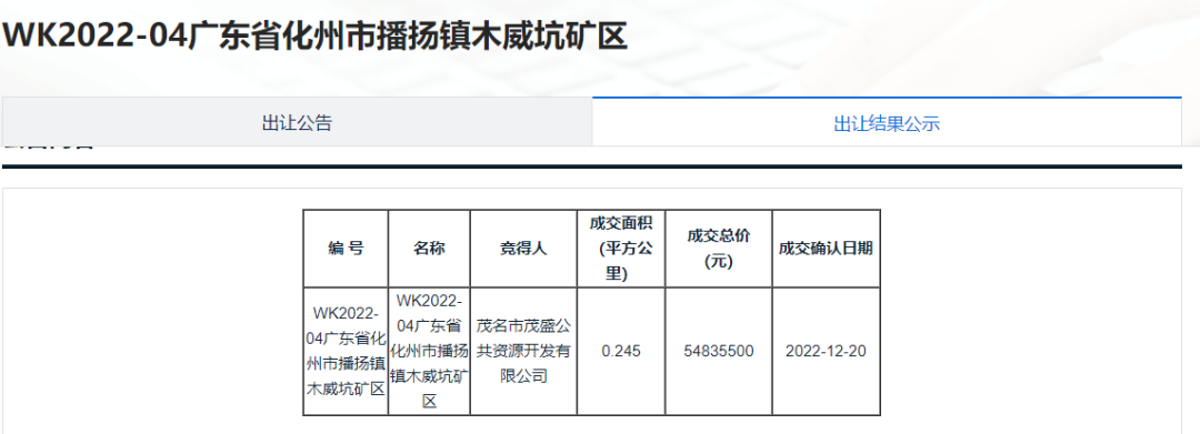 3、化州市播揚鎮(zhèn)木威坑礦區(qū):競得人:茂名市茂盛公共資源開發(fā)有限公司,成交價:5483萬。出讓資源儲量:1624萬m?。礦山設(shè)計生產(chǎn)規(guī)模:100萬m?/年。