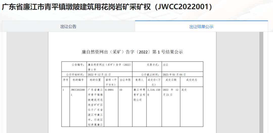 競得人名稱:廉江市粵青礦業(yè)有限公司