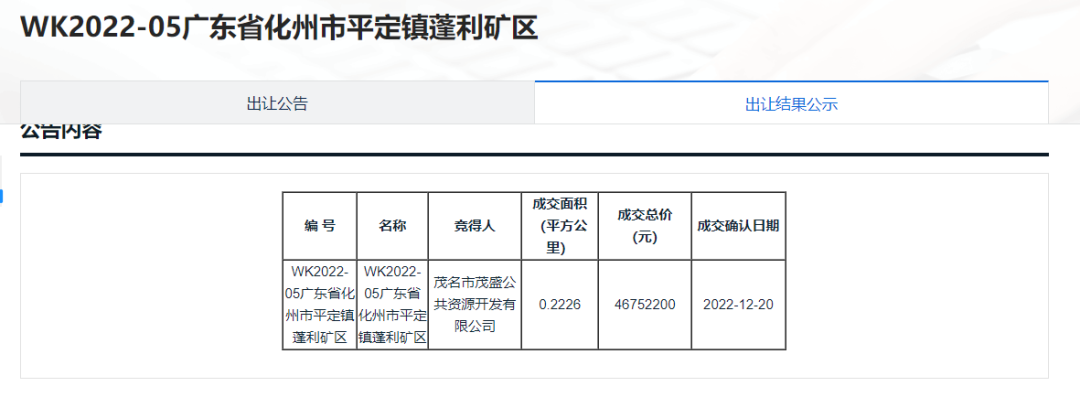 競得人名稱:揭陽市投控礦產(chǎn)資源開發(fā)有限公司