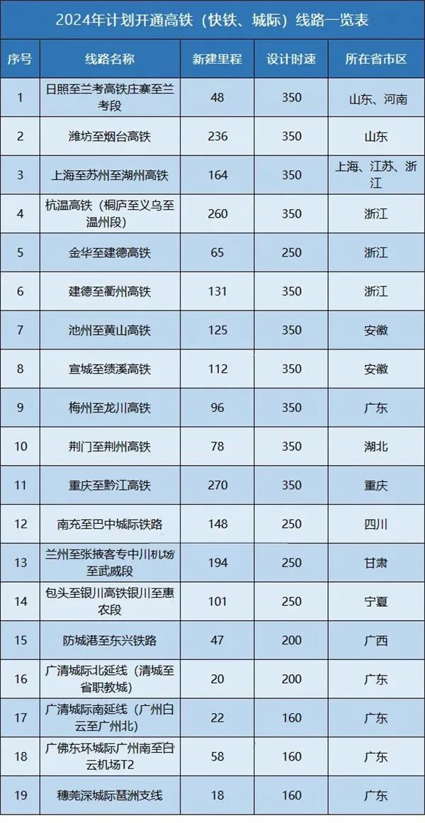 2、到2024年,安徽浙江多條高鐵將開通,長三角地區(qū)高鐵進(jìn)一步加密;隨著重慶至黔江高鐵通車,渝廈高鐵通道重慶至長沙段將全線貫通;日蘭(魯南)高鐵剩余最后一段也將打通;山東半島環(huán)線高鐵全面建成。