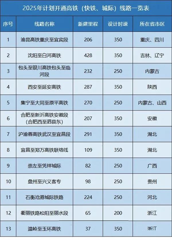 3、到2025年,多個(gè)國家“八縱八橫”高鐵通道部分路段有望貫通,包括京昆高鐵重慶至宜賓段、滬渝蓉高鐵武漢至宜昌段、京蘭高鐵包頭至臨河段、包銀海高鐵西安至延安段、呼南高鐵集大原段等;借助鄭萬高鐵宜昌聯(lián)絡(luò)線,沿江高鐵武漢至重慶全段將率先開通;東北地區(qū)也將新增一條高鐵“東部大通道”。