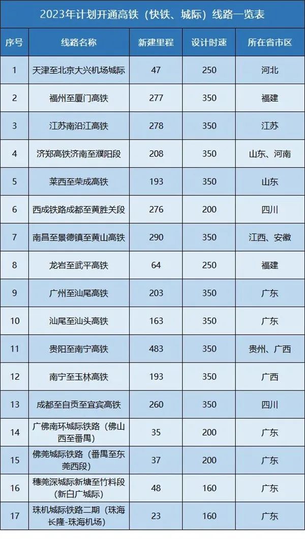 1、在2023年,貴南高鐵通車,貴州和廣西省會(huì)間將實(shí)現(xiàn)高鐵直通;濟(jì)鄭高鐵全線貫通后,山東、河南兩省省會(huì)高鐵將直連;黃昌高鐵開通后安徽與江西間將又多一條高鐵新通道;多個(gè)省省會(huì)至省內(nèi)地市的干線高速鐵路項(xiàng)目將通車;珠三角多條城際鐵路也將開通。