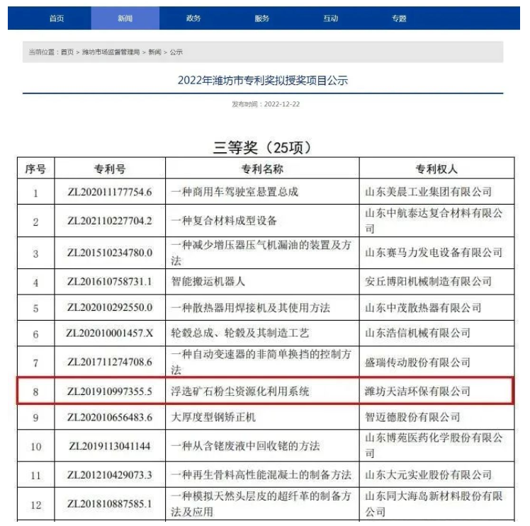 濰坊天潔發(fā)明專利“浮選礦石粉塵資源化利用系統(tǒng)”獲獎