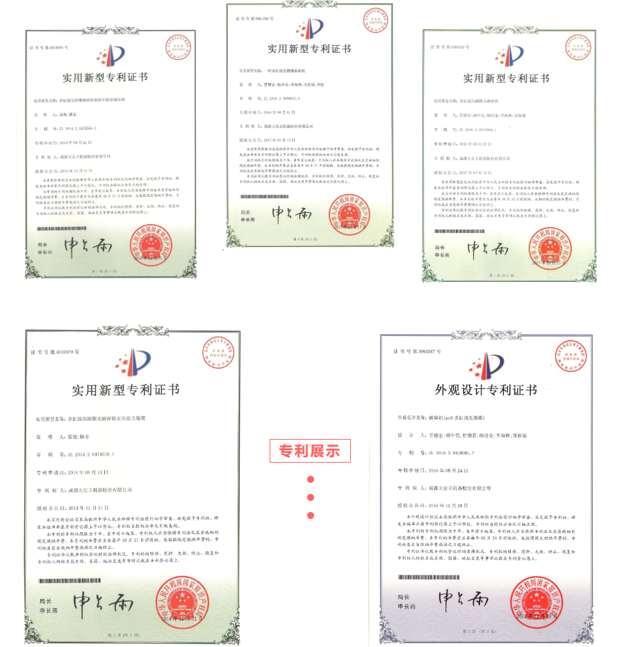 目前,PYD系列多缸液壓圓錐式破碎機(jī)已取得5項(xiàng)專利技術(shù)。
