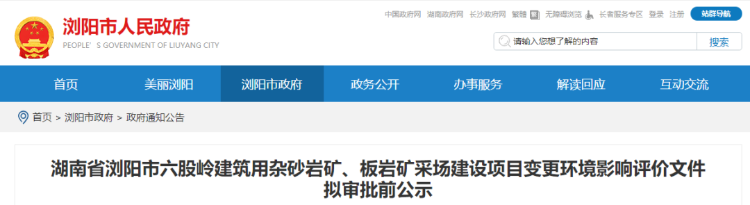 湖南省瀏陽市六股嶺建筑用雜砂巖礦、板巖礦采場(chǎng)建設(shè)項(xiàng)目變更環(huán)境影響評(píng)價(jià)文件擬審批前公示