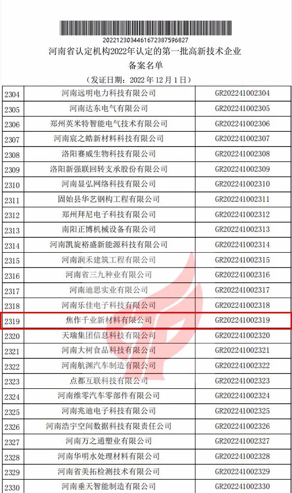 日前,全國高新技術(shù)企業(yè)認定管理工作領(lǐng)導小組辦公室公布了《河南省認定機構(gòu)2022年認定的第一批高新技術(shù)企業(yè)備案名單》,焦作千業(yè)新材料有限公司成功入選。