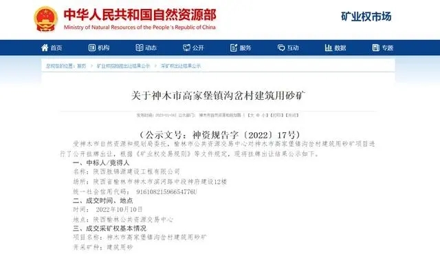 近日,陜西勝錦源建設(shè)工程有限公司以8771.19萬元成功競(jìng)得神木市高家堡鎮(zhèn)溝岔村建筑用砂礦采礦權(quán)。