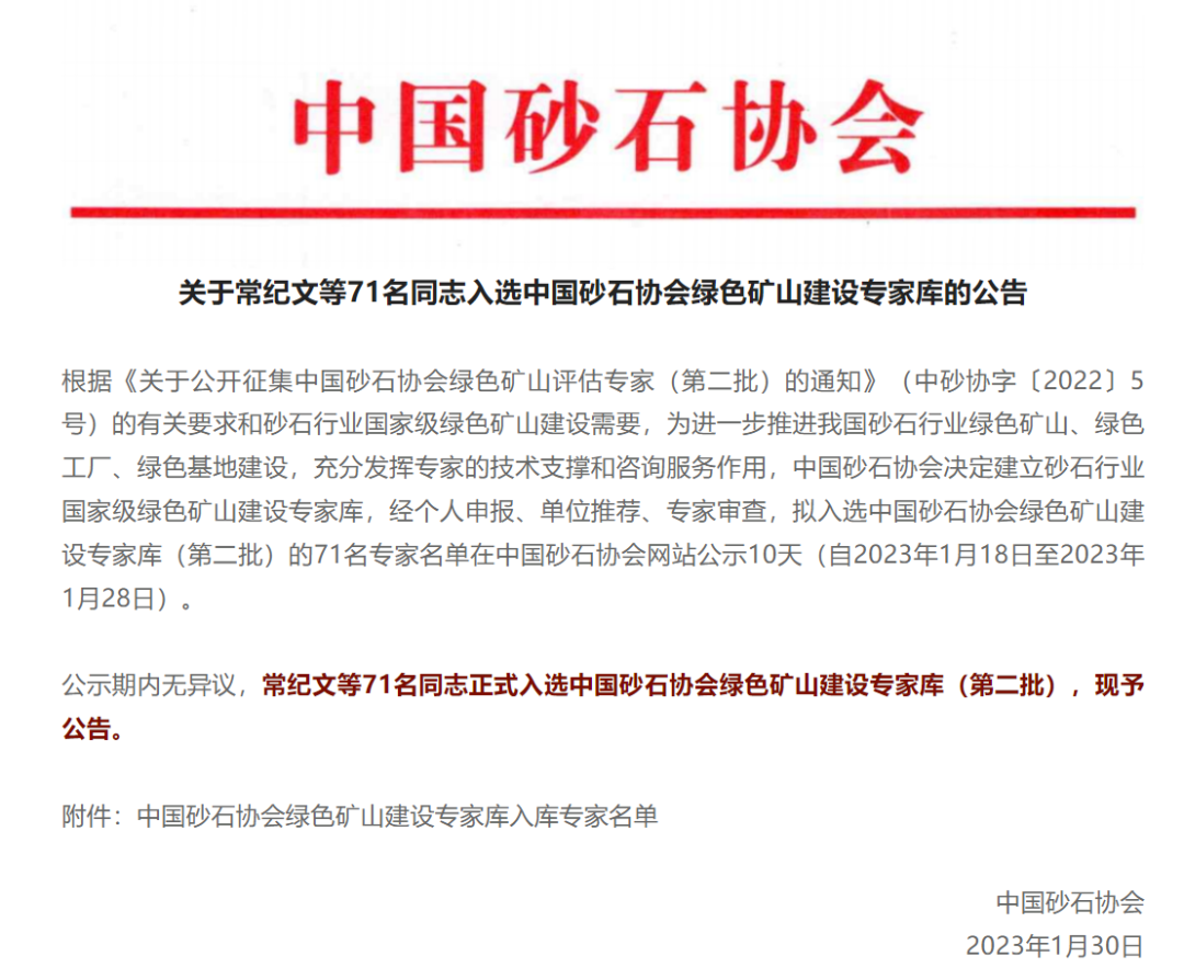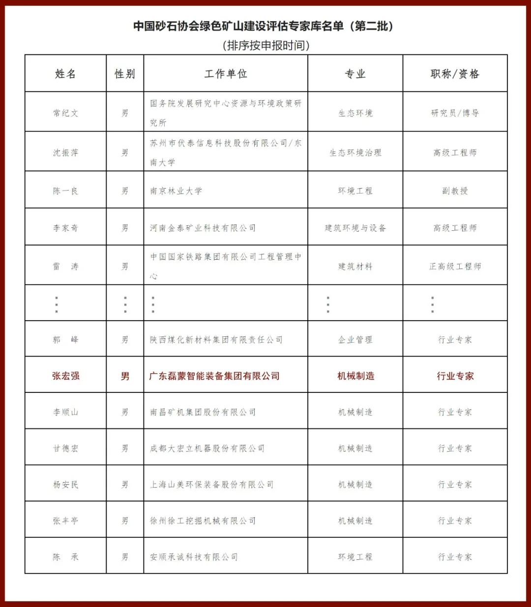近期,中國砂石協(xié)會發(fā)布了“關于常紀文等71名同志入選中國砂石協(xié)會綠色礦山建設專家?guī)斓墓?rdquo;,廣東磊蒙智能裝備集團董事長張宏強作為機械制造行業(yè)專家成功入選!