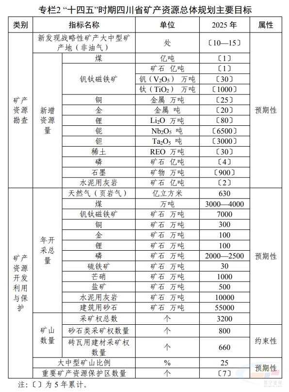 “十四五”時(shí)期,新發(fā)現(xiàn)戰(zhàn)略性礦產(chǎn)資源大中型礦產(chǎn)地10—15處,新增煤炭資源量1億噸、釩鈦磁鐵礦1億噸、銅(金屬)25萬(wàn)噸、金(金屬)20噸、鋰(Li2O)80萬(wàn)噸、稀土(REO)30萬(wàn)噸、磷礦石4億噸、石墨(礦物)900萬(wàn)噸、水泥用灰?guī)r2億噸。