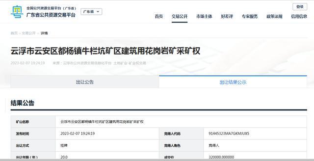 獲悉,2月7日,云浮市自然資源交易中心成功競出云浮市云安區(qū)都楊鎮(zhèn)牛欄坑礦區(qū)建筑用花崗巖礦采礦權(quán)。此礦權(quán)資源儲量14842.59萬方,年生產(chǎn)規(guī)模850萬方,出讓年限20年(含礦山基建期2年,復(fù)墾整治期1年)云浮市云安區(qū)都楊鎮(zhèn)牛欄坑礦區(qū)建筑用花崗巖礦最終成交價為32億元,競得人是中電建(云浮)綠色礦業(yè)有限公司。
