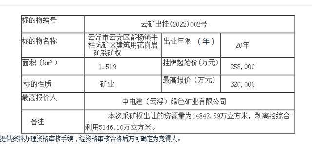 最終競得人:中電建(云浮)綠色礦業(yè)有限公司成交價:32億元