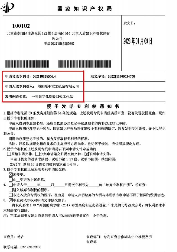近日,洛陽隆中重工機械有限公司收到國家知識產(chǎn)權(quán)局下發(fā)“授予發(fā)明專利權(quán)通知書,授予隆中重工“一種數(shù)字化洗砂回收工作站”發(fā)明專利。