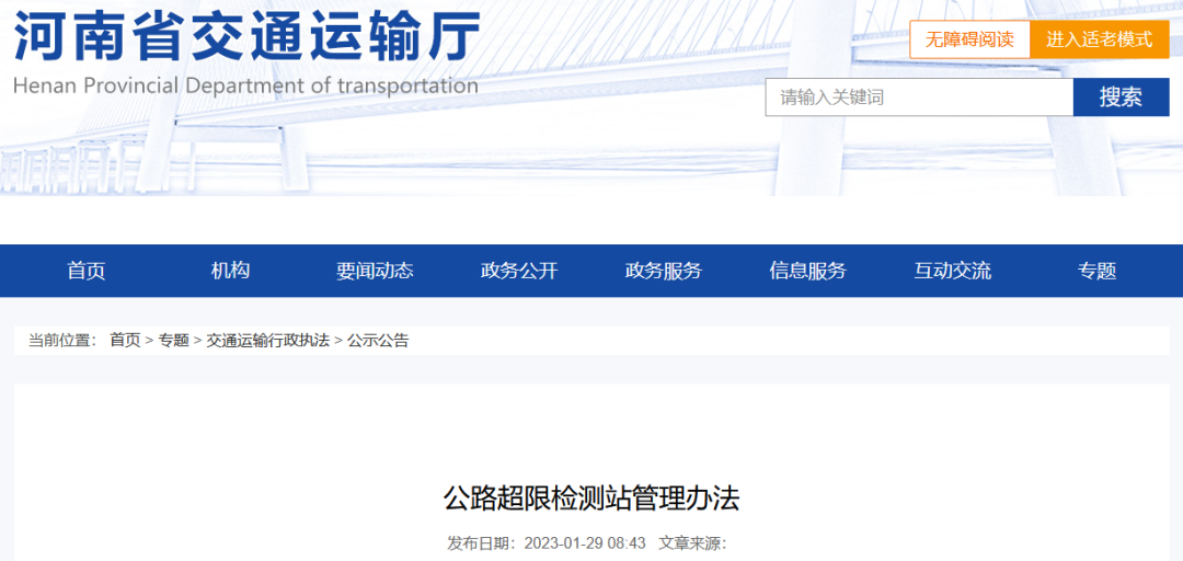 1月29日,河南交通運輸廳在官網上發(fā)布了《公路超限檢測站管理辦法(試行)》,自印發(fā)之日起試行。