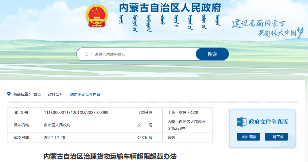 《內蒙古自治區(qū)治理貨物運輸車輛超限超載辦法》以258號主席令公布,自2023年3月1日起施行。《辦法》共五章,四十二條,根據自治區(qū)實際情況,分別從源頭管理、路面治理和法律責任等幾個方面作出了規(guī)定。