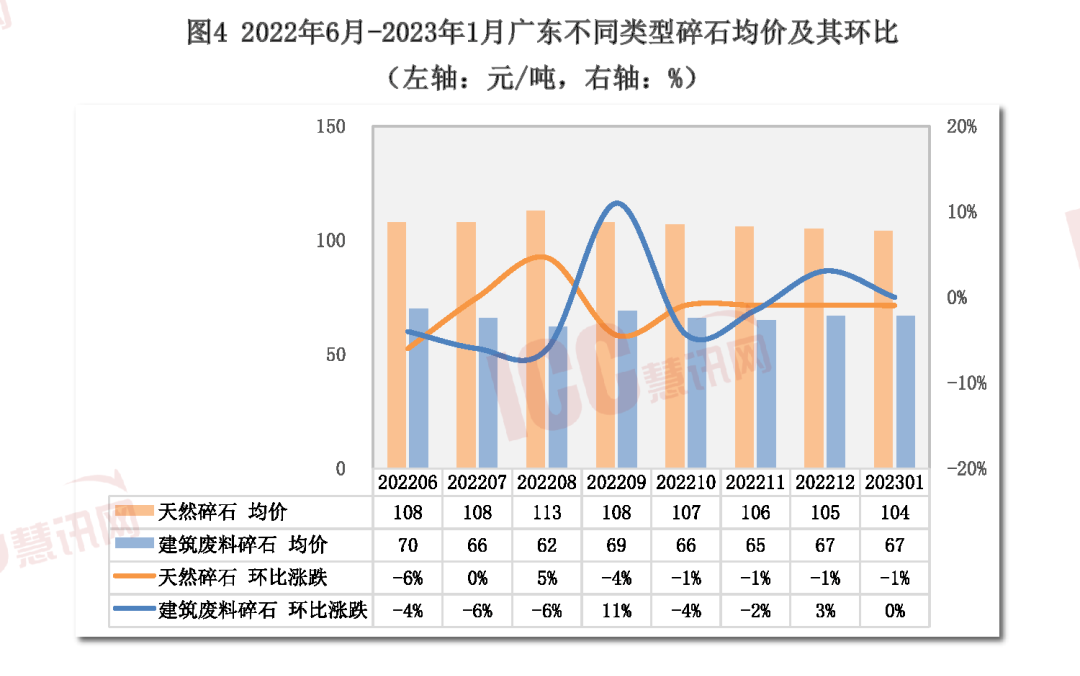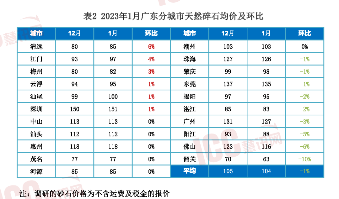1月份成功調(diào)研廣東碎石83個樣本。其中天然碎石為104元/t,環(huán)比12月下跌1%;建筑廢料碎石為67元/t,和上月保持一致。