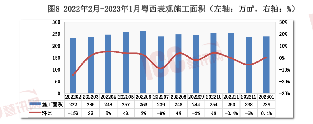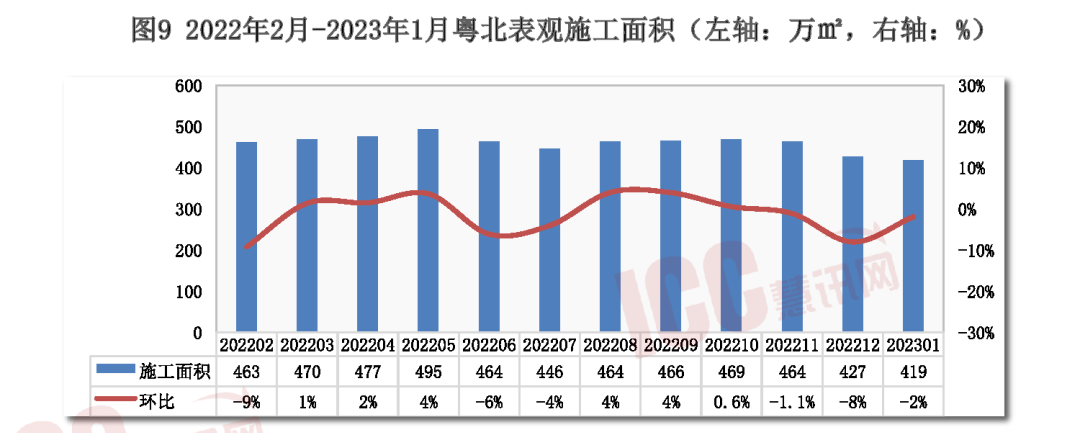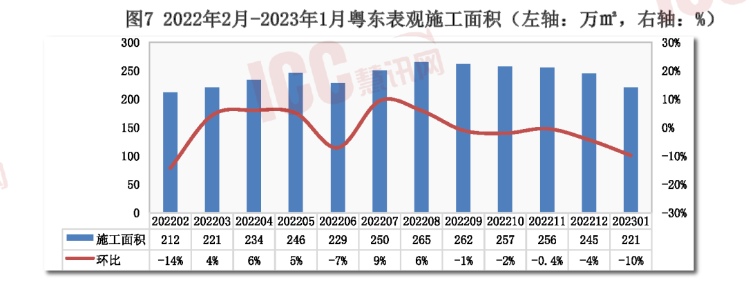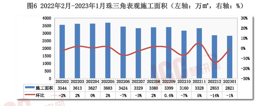 進入2023年,受春節(jié)假期影響,部分項目春節(jié)前搶工,大部分項目施工暫停或放緩,至月底才緩慢開工,施工速度有待恢復(fù)。表觀施工面積上除粵西略有增長外,珠三角,粵東和粵北區(qū)域表觀施工面積均有所回落。其中粵東施工面積降幅最大,環(huán)比下跌10%,珠三角和粵北分別下跌1%和2%。