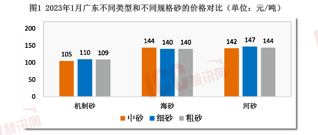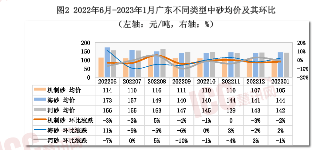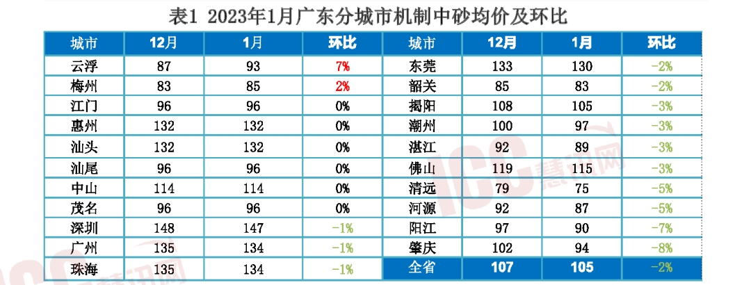 1月份調(diào)研砂樣本量225個。以中砂為例,機制砂105元/t,較12月下降2%;海砂144元/t,環(huán)比增長2%;河砂142元/t,環(huán)比下滑1%。