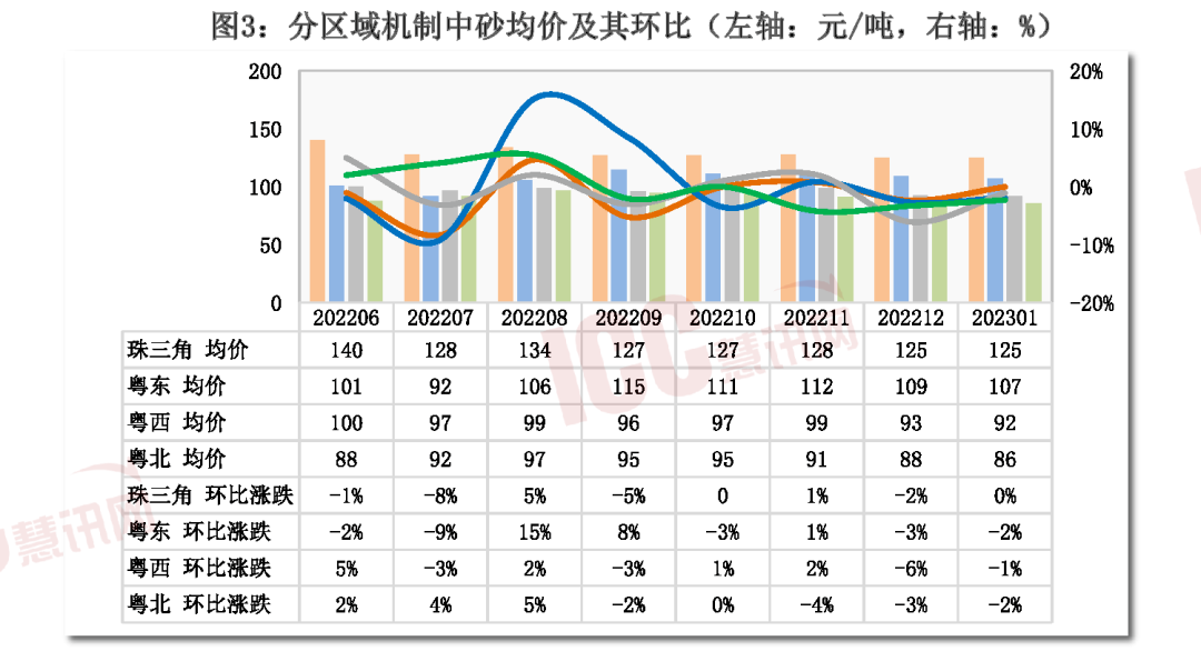 以機制中砂為例,全省平均價格較上月環(huán)比下滑2%。從區(qū)域看,本月四個區(qū)域除珠三角區(qū)域和上月持平外,其他區(qū)域均小幅下跌,其中粵東和粵北下跌幅度一致為2%,粵西下跌1%。從各城市情況看,超一半城市機制砂價格下跌,部分城市和上月持平。肇慶下跌幅度最大為8%,云浮增長最多,環(huán)比增長7%。