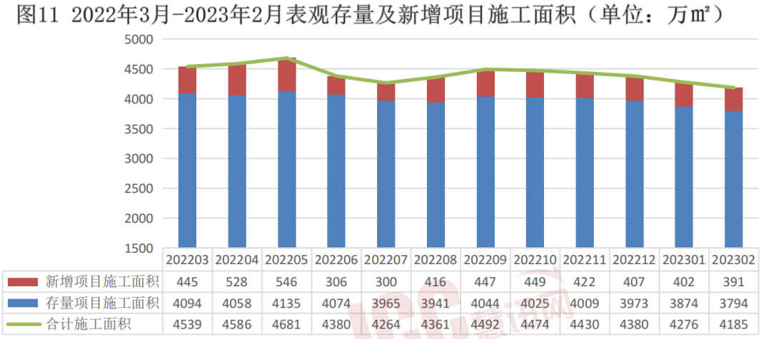 2023年2月表觀存量項目施工面積約3794萬㎡,近半年月均新增項目施工面積約391萬㎡,預(yù)計2023年2月總施工面積約4185萬㎡,整體低于2023年1月。