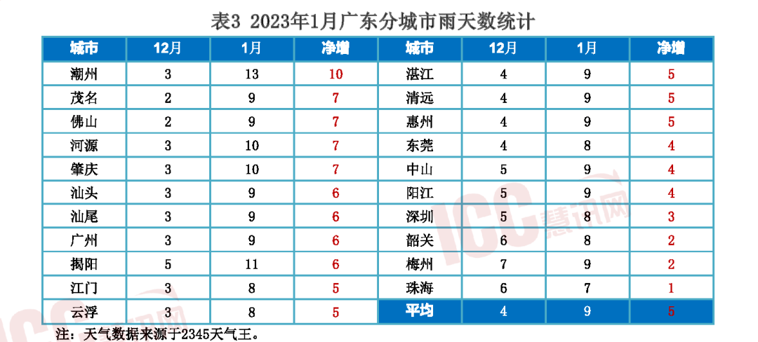 1月各城市雨水天氣均有所增加,一半城市雨水天比上月增加超過5天。其中潮州雨水天比上月增加10天。雨水天氣主要集中在年前一周,很多項目已停工或減緩施工,整體對開工率相對影響不大。