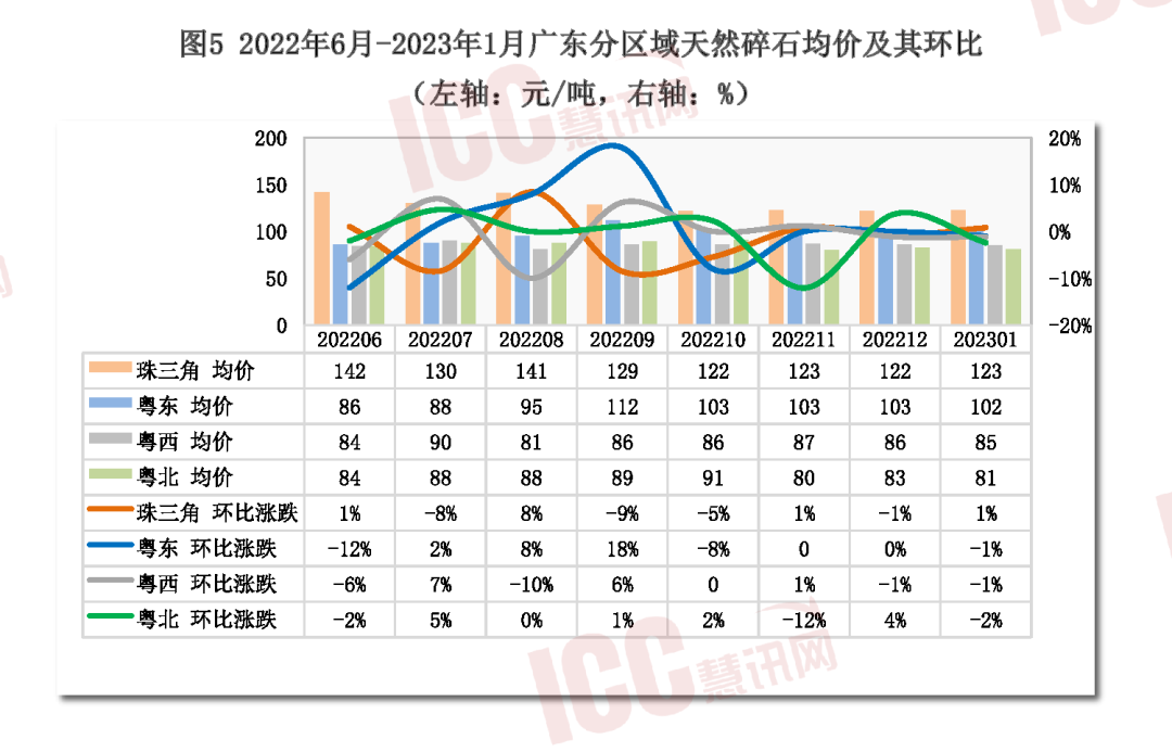 以天然碎石為例,全省平均價格較上月小幅回落1%。從區(qū)域看,珠三角微幅上漲1%,粵東和粵西均同比下滑1%,粵北下滑2%。從城市面看,全省天然碎石價格漲跌互現(xiàn),六個城市碎石價格沒有變化。其中清遠增長幅度最大,環(huán)比增長為6%,韶關(guān)下跌幅度最大為10%。