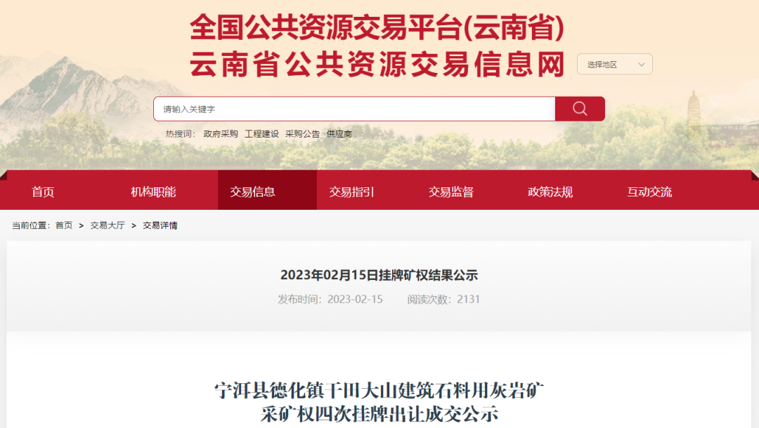 根據(jù)《國土資源部關(guān)于印發(fā)<礦業(yè)權(quán)交易規(guī)則>的通知》(國土資規(guī)〔2017〕7號)、《云南省人民政府關(guān)于印發(fā)云南省探礦權(quán)采礦權(quán)管理辦法(2015年修訂)和云南省礦業(yè)權(quán)交易辦法(2015年修訂)的通知》(云政發(fā)〔2015〕49號)等相關(guān)文件規(guī)定,寧洱縣政府采購和出讓中心受寧洱縣自然資源局委托于2023年2月1日08時00分至2月15日10時00分公開掛牌寧洱縣德化鎮(zhèn)干田大山建筑石料用灰?guī)r礦采礦權(quán),現(xiàn)將成交結(jié)果公示如下: