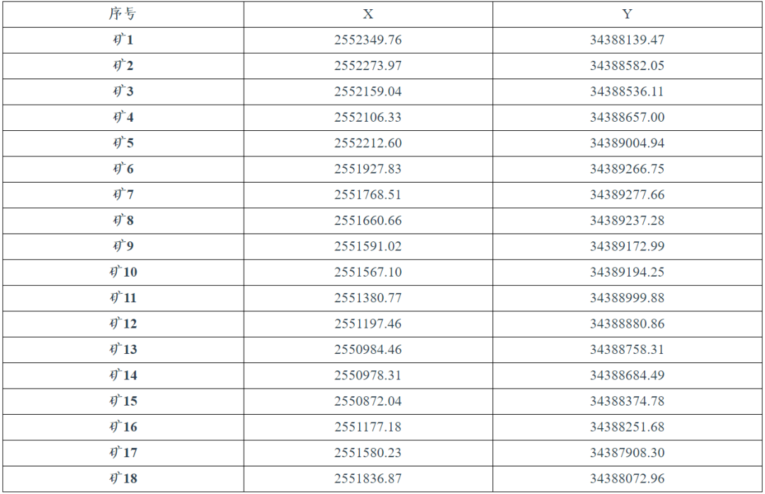 (二)地理位置:寧洱縣德化鎮(zhèn)干田村與窩拖村交界處礦區(qū)面積1.2409平方千米。礦種為灰?guī)r礦,出讓年限為30年,擬設(shè)為建筑石料用灰?guī)r礦。礦區(qū)范圍由18個拐點圈定,其18個拐點平面直角坐標(biāo)(2000坐標(biāo)系)為: