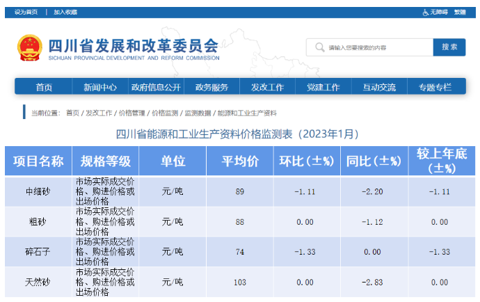 從四川省發(fā)改委了解,2023年1月四川省砂石價格較2022年12月有小幅度微降,其中:中細砂89元/噸,價格相較上月微降1.11%;粗砂均價88元/噸,價格相較上月保持持平;碎石子均價74元/噸,價格相較上月微降1.33%;天然砂均價103元/噸,價格相較上月保持持平。