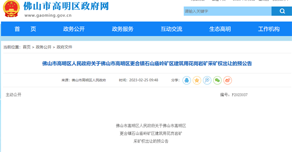 為穩(wěn)定建筑石料供應(yīng),支撐重大工程建設(shè),佛山市高明區(qū)人民政府將于近期通過網(wǎng)上掛牌方式出讓佛山市高明區(qū)更合鎮(zhèn)石山廟嶺礦區(qū)建筑用花崗巖礦采礦權(quán)。為方便潛在競買人更好地了解礦山信息,提前做好投資計劃,佛山市高明區(qū)人民政府發(fā)布《預(yù)公告》。