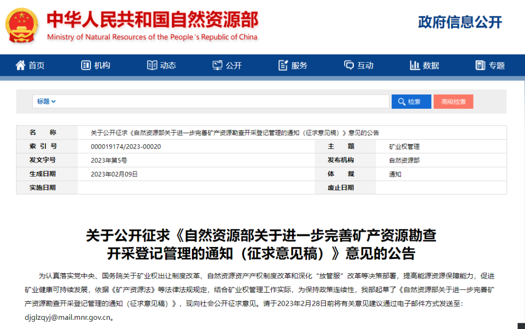 2023年2月9日,自然資源部發(fā)布關(guān)于公開征求《自然資源部關(guān)于進(jìn)一步完善礦產(chǎn)資源勘查開采登記管理的通知(征求意見稿)》意見的公告,其中從礦產(chǎn)資源勘查登記管理、探礦權(quán)變更登記管理、礦產(chǎn)資源開采登記管理、采礦權(quán)新立、延續(xù)登記管理,采礦權(quán)變更、注銷登記管理等方面進(jìn)行了完善和規(guī)范,并對(duì)礦業(yè)權(quán)申請(qǐng)資料做出精簡(jiǎn)。