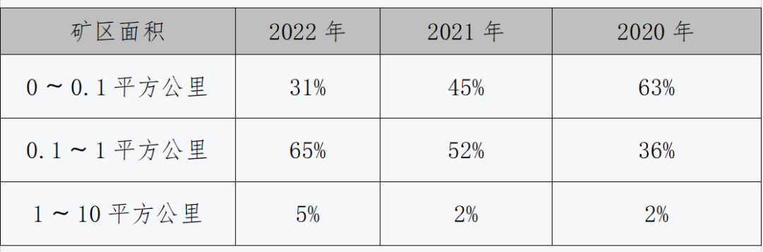 從新設(shè)砂石礦權(quán)礦區(qū)面積來(lái)看,砂石行業(yè)規(guī)模化水平進(jìn)一步提升,礦區(qū)面積0.1~1平方公里之間砂石礦權(quán)占新設(shè)砂石礦權(quán)六成以上,成為新設(shè)礦權(quán)的主流。新設(shè)砂石礦權(quán)中,礦區(qū)面積在0~0.1平方公里之間的有222宗,占比為31%,占比較2021年下降14個(gè)百分點(diǎn),新設(shè)小規(guī)模砂石礦權(quán)數(shù)量持續(xù)減少;礦區(qū)面積在0.1~1平方公里之間的新設(shè)砂石礦權(quán)有464宗,占比逐年提升,2022年已經(jīng)達(dá)到65%;礦區(qū)面積在1~10平方公里之間的新設(shè)砂石礦權(quán)33宗,占比為5%。