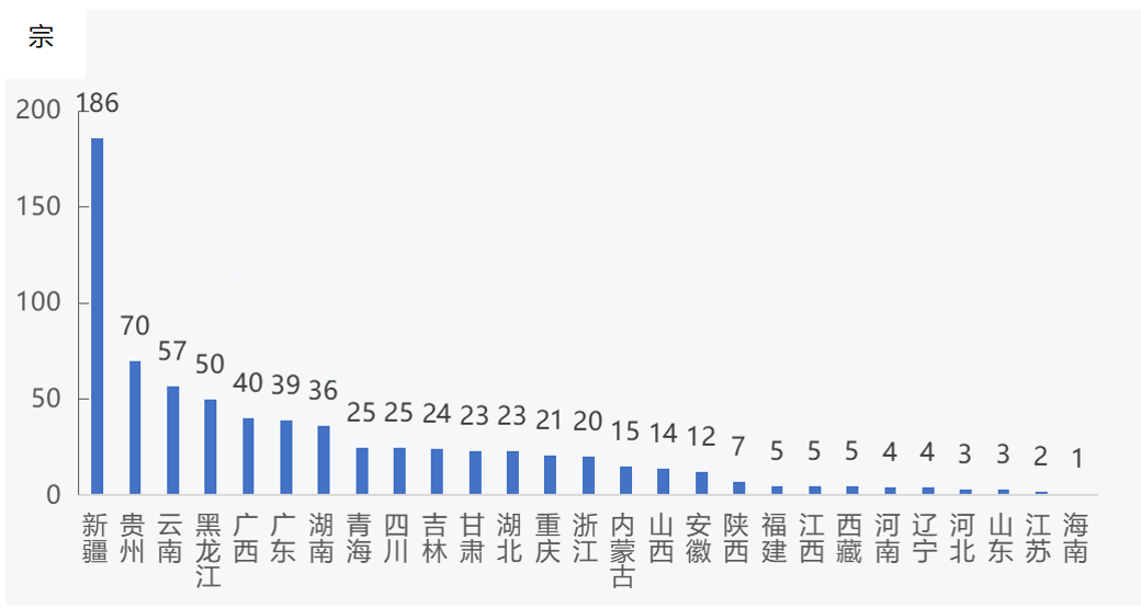 2022年,全國(guó)新設(shè)砂石礦權(quán)數(shù)量719宗,其中新疆新設(shè)砂石礦權(quán)數(shù)量最多,為186宗;貴州、云南、黑龍江新設(shè)砂石礦權(quán)數(shù)量為50~70宗;廣西、廣東、湖南新設(shè)砂石礦權(quán)數(shù)量為35~40宗;青海、四川、吉林、甘肅、湖北、重慶、浙江、內(nèi)蒙古、山西、安徽新設(shè)砂石礦權(quán)數(shù)量為10~25宗;陜西、福建、江西、西藏、河南、遼寧、河北、山東、江蘇、海南新設(shè)砂石礦權(quán)數(shù)量在10宗以內(nèi)。