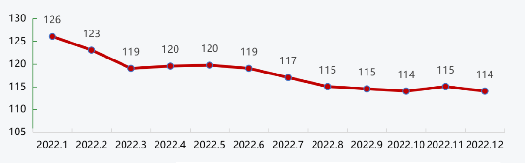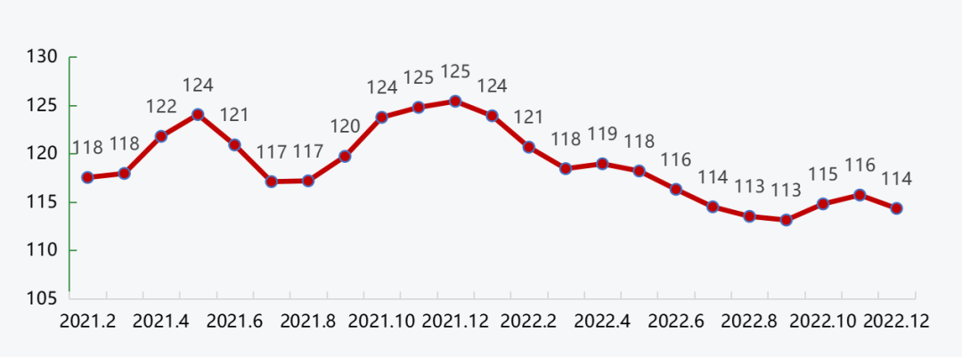 沿江城市砂石價(jià)格在年初高位運(yùn)行的基礎(chǔ)上,受到疫情封港、下游需求不佳、沿江運(yùn)費(fèi)高企等因素的影響,價(jià)格持續(xù)回落,進(jìn)入四季度,隨著施工旺季的到來(lái),需求回升,價(jià)格也隨著略有回升。整體來(lái)看,2022年沿江港口砂石價(jià)格持續(xù)回落,12月降至114元/噸,較年初下降3.4%。