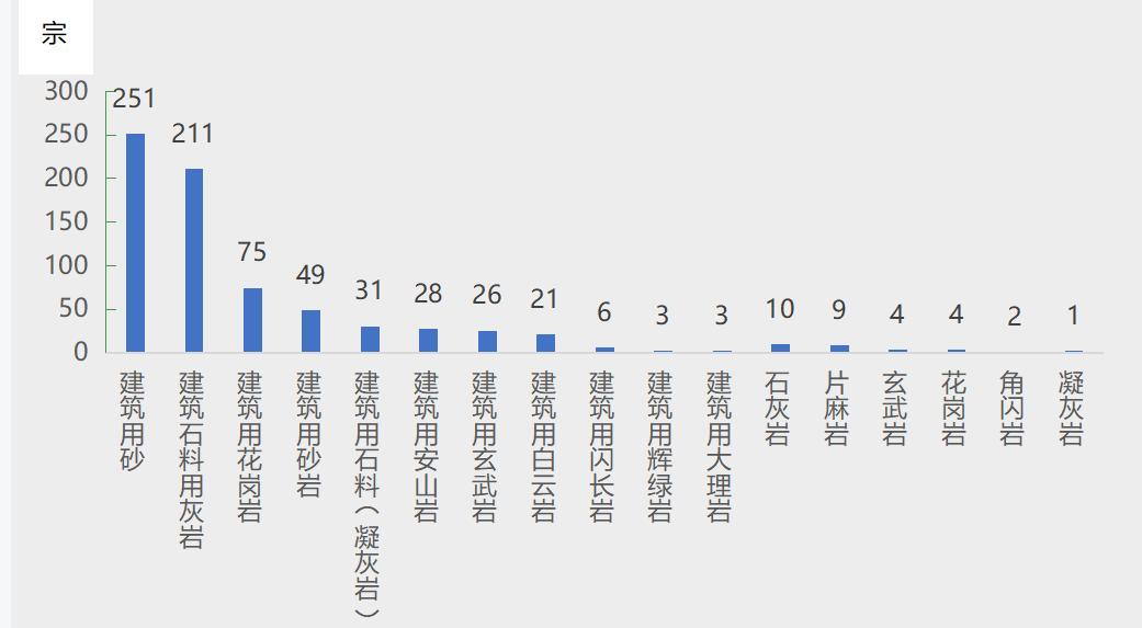 全國(guó)新設(shè)砂石礦權(quán)中,有建筑用砂、建筑石料用灰?guī)r、建筑用花崗巖、建筑用砂巖、建筑用石料(凝灰?guī)r)、建筑用安山巖、建筑用玄武巖、建筑用白云巖、石灰?guī)r、片麻巖、建筑用閃長(zhǎng)巖、玄武巖、花崗巖、建筑用輝綠巖、建筑用大理巖、角閃巖、凝灰?guī)r17種礦種。其中建筑用砂、建筑石料用灰?guī)r兩類礦種新設(shè)數(shù)量最多,分別為251宗、211宗;建筑用花崗巖礦75宗;建筑用砂巖、建筑用石料(凝灰?guī)r)、建筑用安山巖、建筑用玄武巖、建筑用白云巖五類礦種新設(shè)數(shù)量在20~50宗;建筑用閃長(zhǎng)巖、建筑用輝綠巖、建筑用大理巖三類礦種新設(shè)數(shù)量在10宗以內(nèi);另外,新設(shè)10宗石灰?guī)r礦、9宗片麻巖礦、4宗玄武巖礦、4宗花崗巖礦、2宗角閃巖礦、1宗凝灰?guī)r礦。
