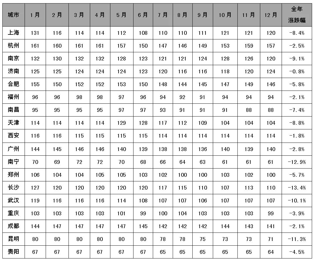 全國(guó)重點(diǎn)城市2022年砂石行情月度變化表(元/噸)