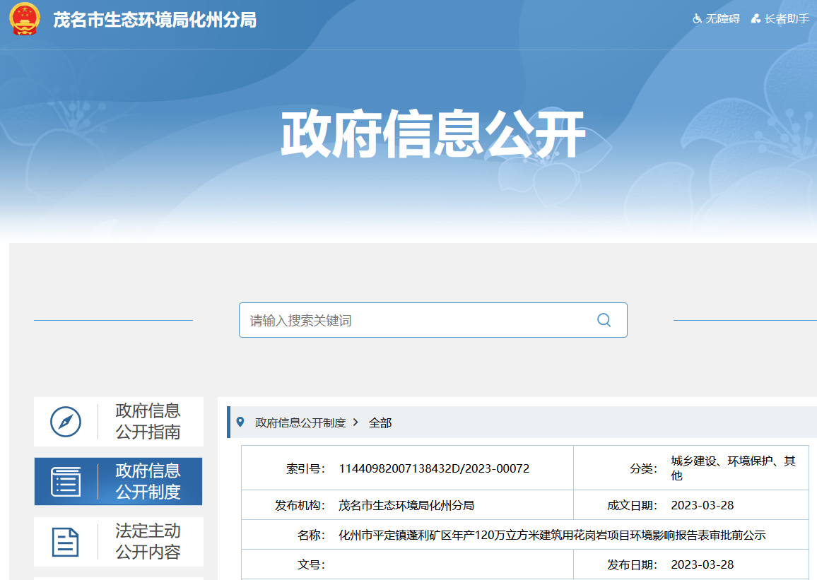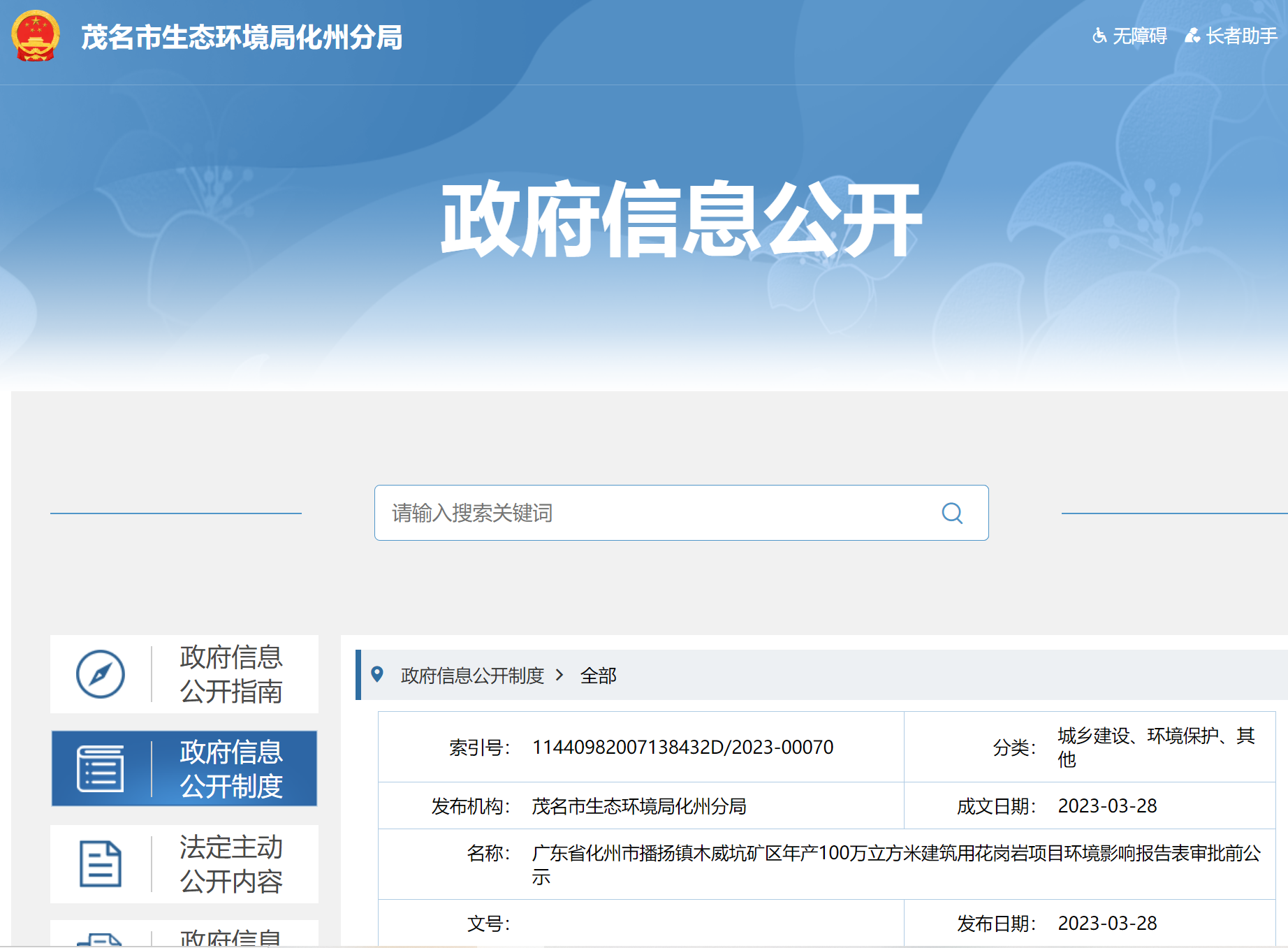 據(jù)悉,近日,廣東省茂名市生態(tài)環(huán)境局化州分局批復(fù)了化州市平定鎮(zhèn)蓬利礦區(qū)年產(chǎn)120萬立方米建筑用花崗巖項目、化州市播揚鎮(zhèn)木威坑礦區(qū)年產(chǎn)100萬立方米建筑用花崗巖項目的環(huán)境影響報告。值得注意的是,兩個項目的建設(shè)單位茂名市茂盛蓬越礦業(yè)有限公司、茂名市茂盛冠威礦業(yè)有限公司均為茂名市茂盛公共資源開發(fā)有限公司全資控股的國有企業(yè)。