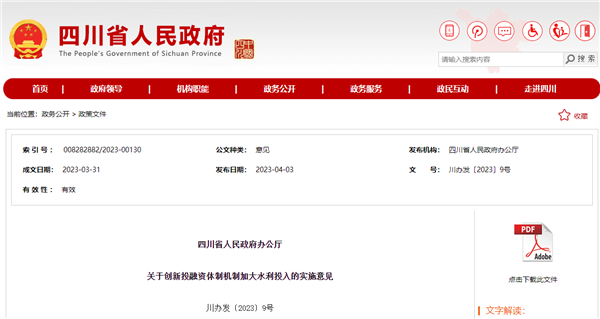 近日,四川省政府辦公廳印發(fā)《關(guān)于創(chuàng)新投融資體制機制加大水利投入的實施意見》(以下簡稱《意見》),強調(diào)要梯次推進(jìn)重大水利工程