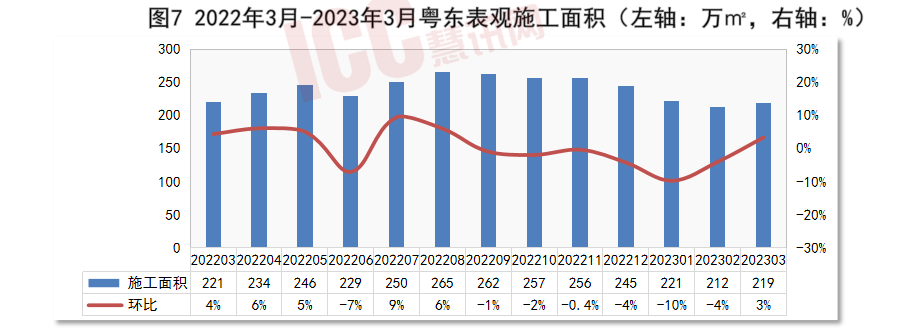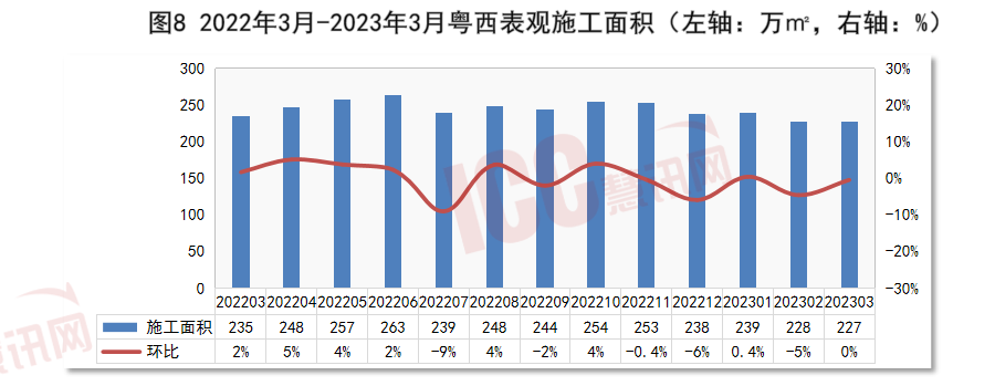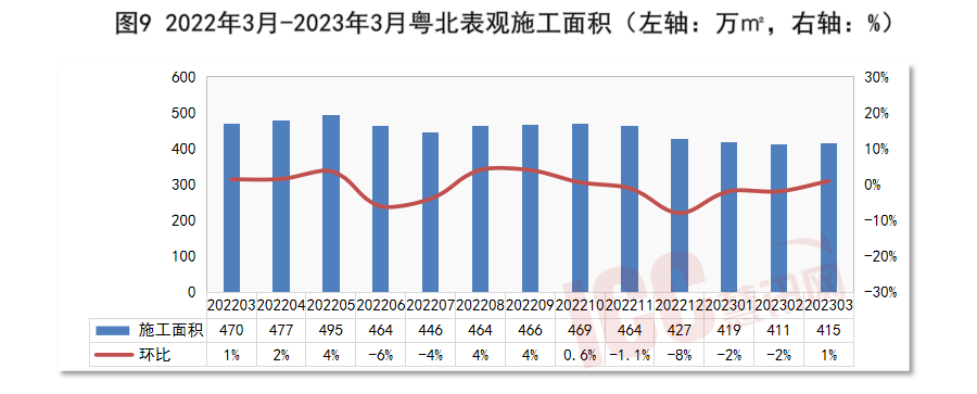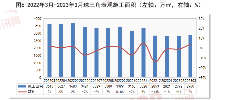 在區(qū)域差異表現上,3月珠三角表觀施工面積比前2個月有些許上漲,為2900萬㎡。粵北表觀施工面積僅次于珠三角,大于粵東和粵西區(qū)域,為415萬㎡,仍是粵東和粵西區(qū)域的兩倍左右。