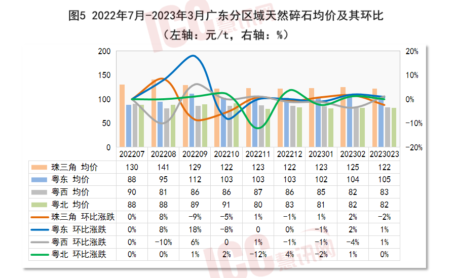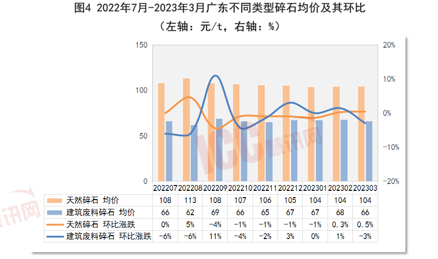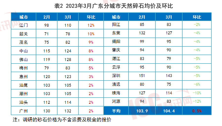 3月份成功調研廣東碎石88個樣本。其中天然碎石為104元/t,環(huán)比上漲0.5%;建筑廢料碎石為66元/t,環(huán)比上月下跌3%。