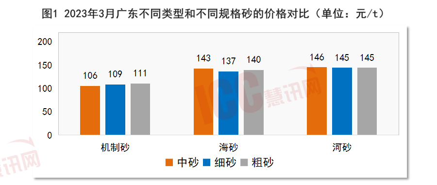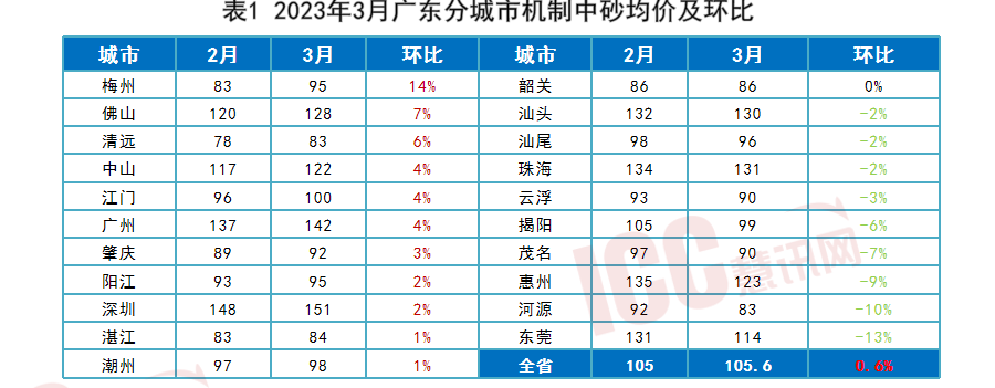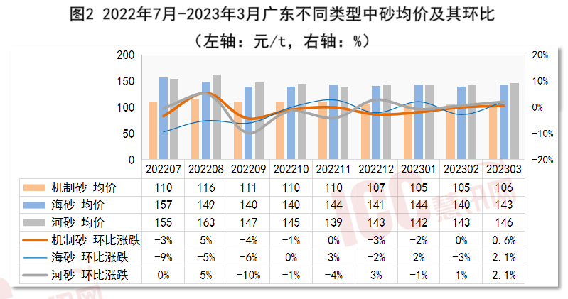 3月份廣東新礦開采數量相對上個月有所減少,礦場復工復產良好,項目有序推進,但3月份逐漸轉入雨季,雨水天增加,不太利于砂石的開工開采。3月份,廣東機制砂106元/t,環(huán)比上漲0.6%;海砂143元/t,環(huán)比上漲2.1%;河砂146元/t,環(huán)比上漲2.1%。整體來看,預計4月砂石價格將穩(wěn)中有升。